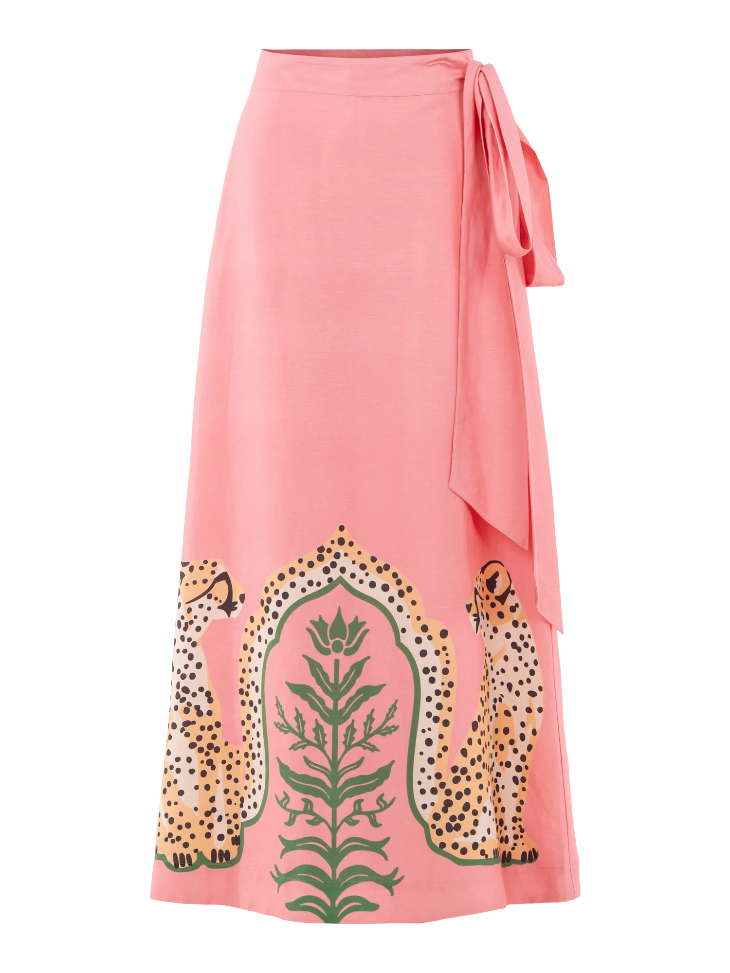 The Audrey Skirt in Cabana Cat is a statement in fluid playfulness. Designed with a high-waisted silhouette, it features a pre-tied, tacked bow at the waist and a clean side zip closure for a clean finish. The Cabana Cat motif introduces a sense of whimsical majesty, showcasing symmetrical regal cheetahs framing lush greenery for a look that feels both artful and elevated.