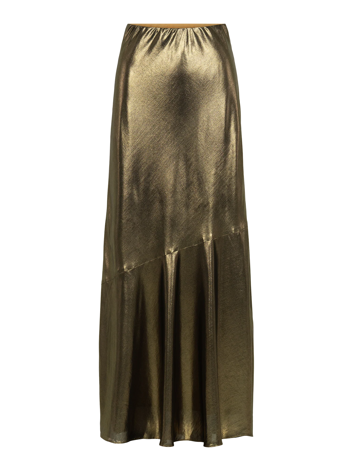 The Bias Skirt in Liquid Gold brings effortless glamour to any occasion. Designed with a flattering high-waisted silhouette, this maxi-length skirt features an elastic waistband for ease and comfort, while the bias cut allows the fabric to drape fluidly over the body. The metallic finish catches and reflects the light with every step, creating a luminous effect that’s both striking and refined. Perfect for holiday parties and special occasions.