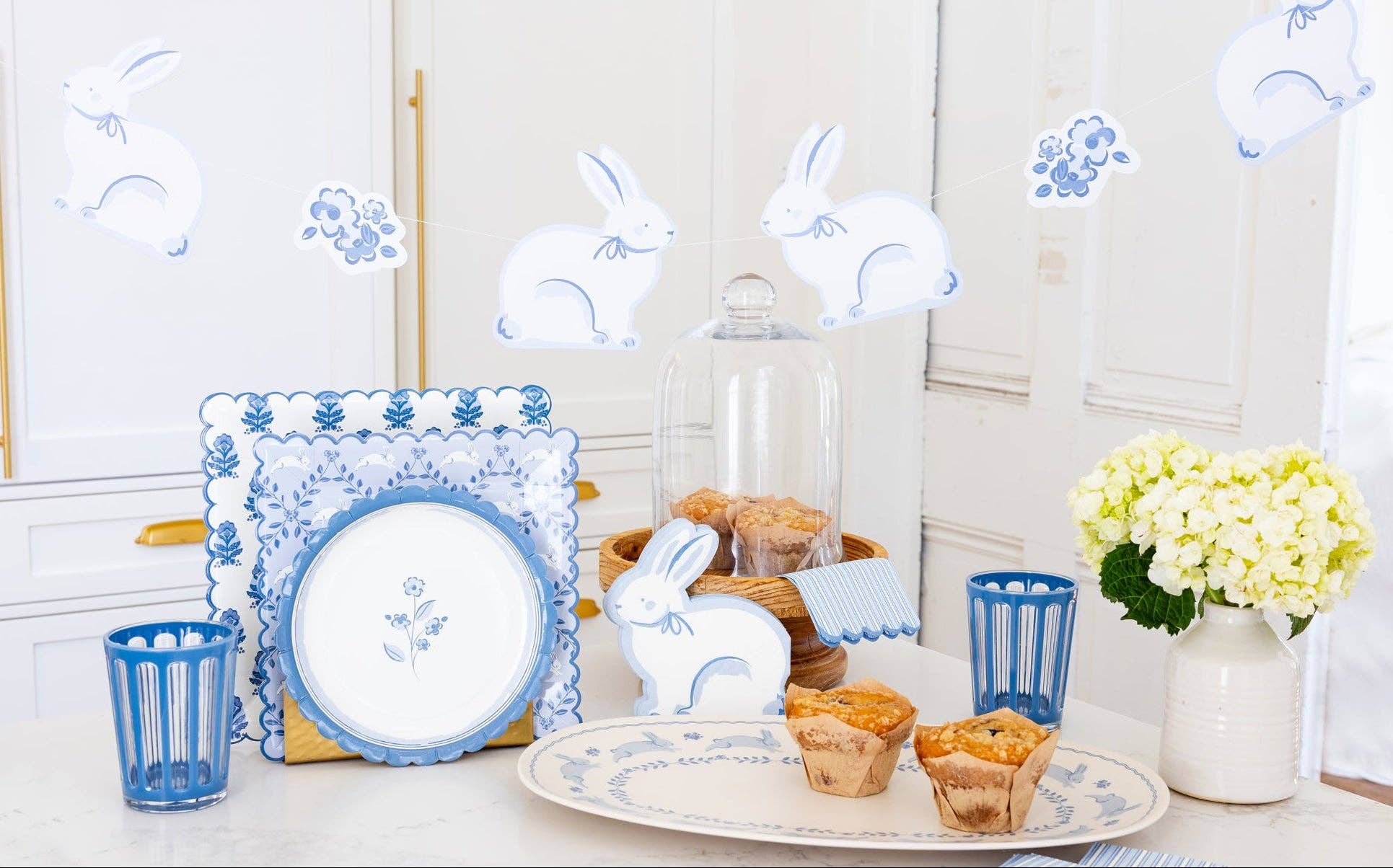 Bring springtime charm to your Easter celebration with this delightful 10" square plate featuring a cheerful light blue and cream flower block print design. Perfect for festive table settings, this charming piece adds a pop of botanical beauty to your holiday spread.