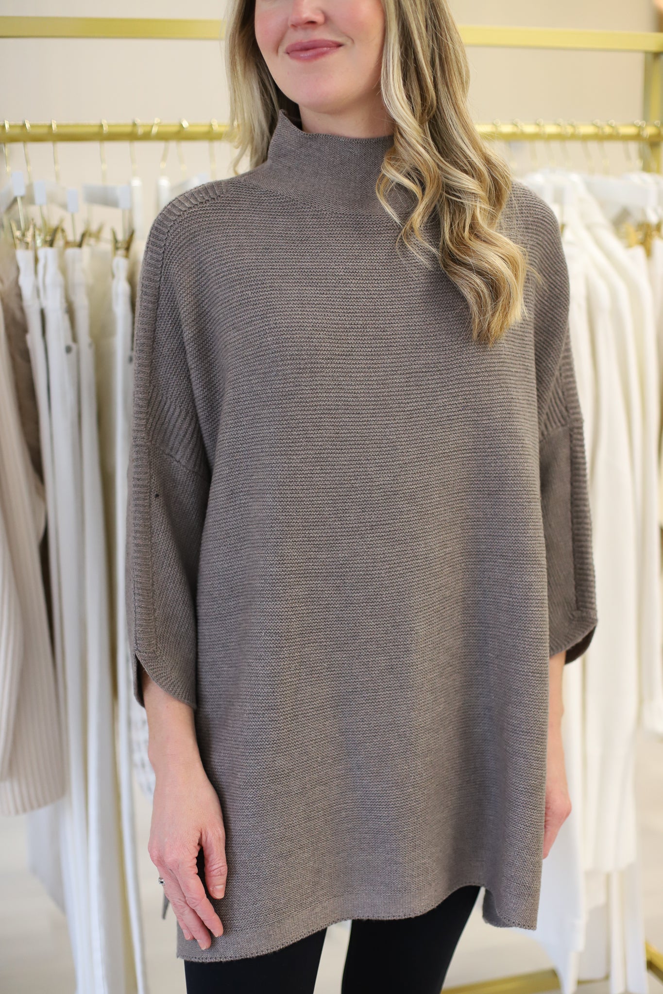 The sophisticated silhouette, side slit detail, and contrasting rib pattern are what make this piece a must-have for fall and winter! You will find yourself living in this sweater with jeans and leggings. You might need more than 1 color!