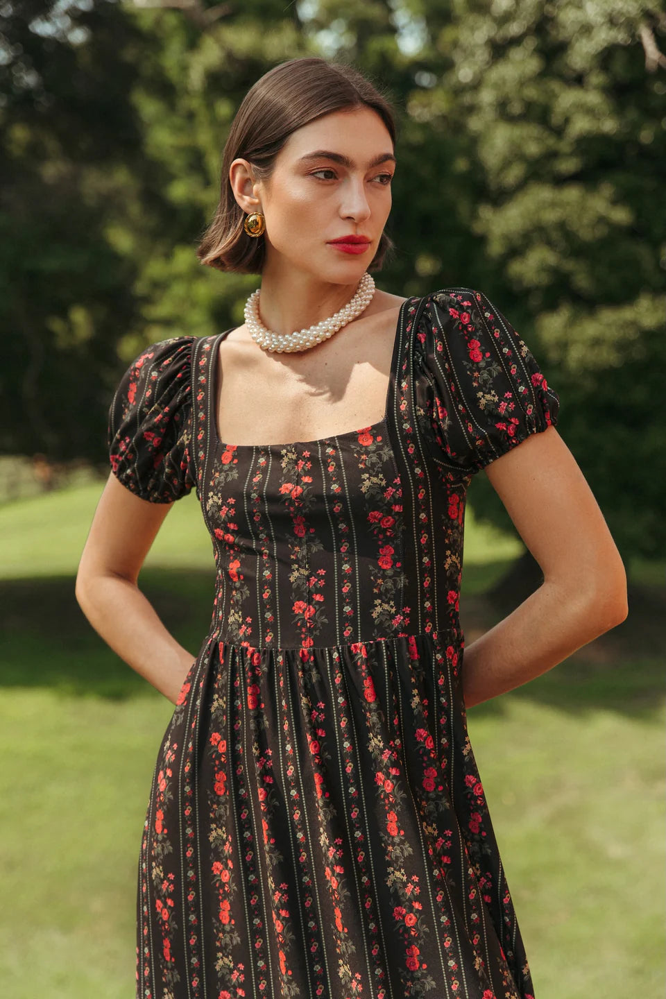 Think of it as everyday Bridgerton wear. You'll love the faux boning on the bodice for a figure-flatting shape with a gorgeous bottom tier. Oversized puff sleeves make this romantic midi a favorite.