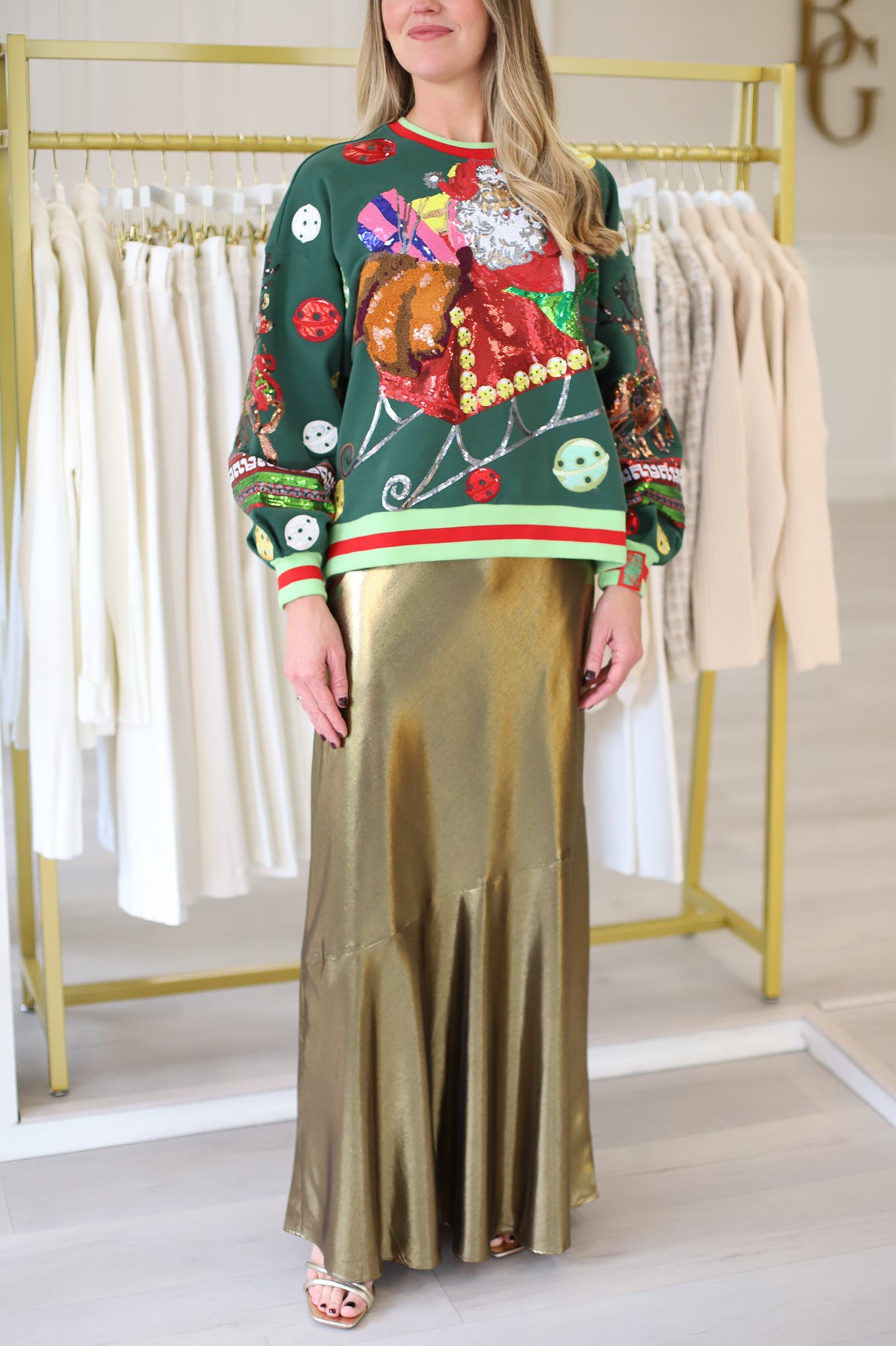 Queen of Sparkles Dark Green Vintage Jingle Bell Santa Sweatshirt