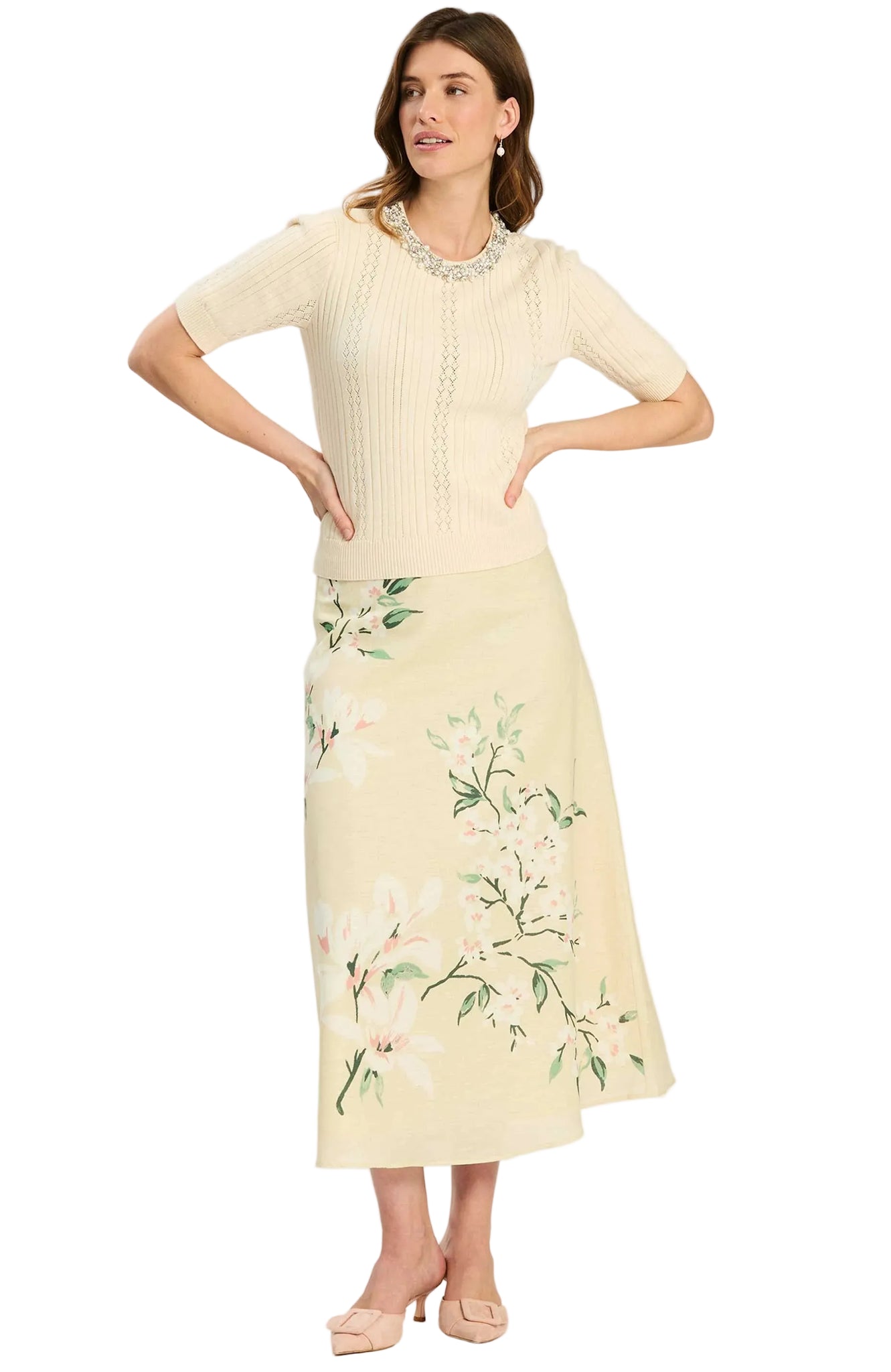 This feminine knit is a refined take on an everyday essential. Designed with delicate pointelle detailing throughout, it features an elegant mix of pearls and subtle crystal embellishments along the neckline for just the right amount of polish and sparkle. The short sleeves and classic crew silhouette keep it timeless and easy to wear, while the lightweight knit makes it perfect for layering or wearing on its own. Effortless yet elevated, this is the kind of piece that instantly dresses up denim or pairs beautifully with a printed skirt for a more polished look.