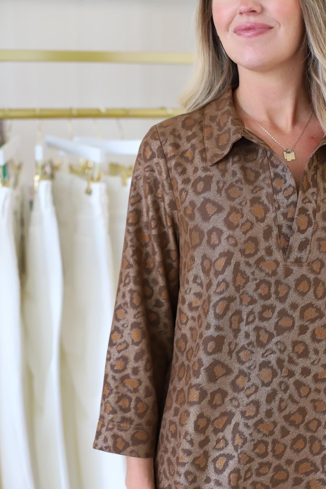 Jade Golden Leopard Collard Bell Sleeve Dress