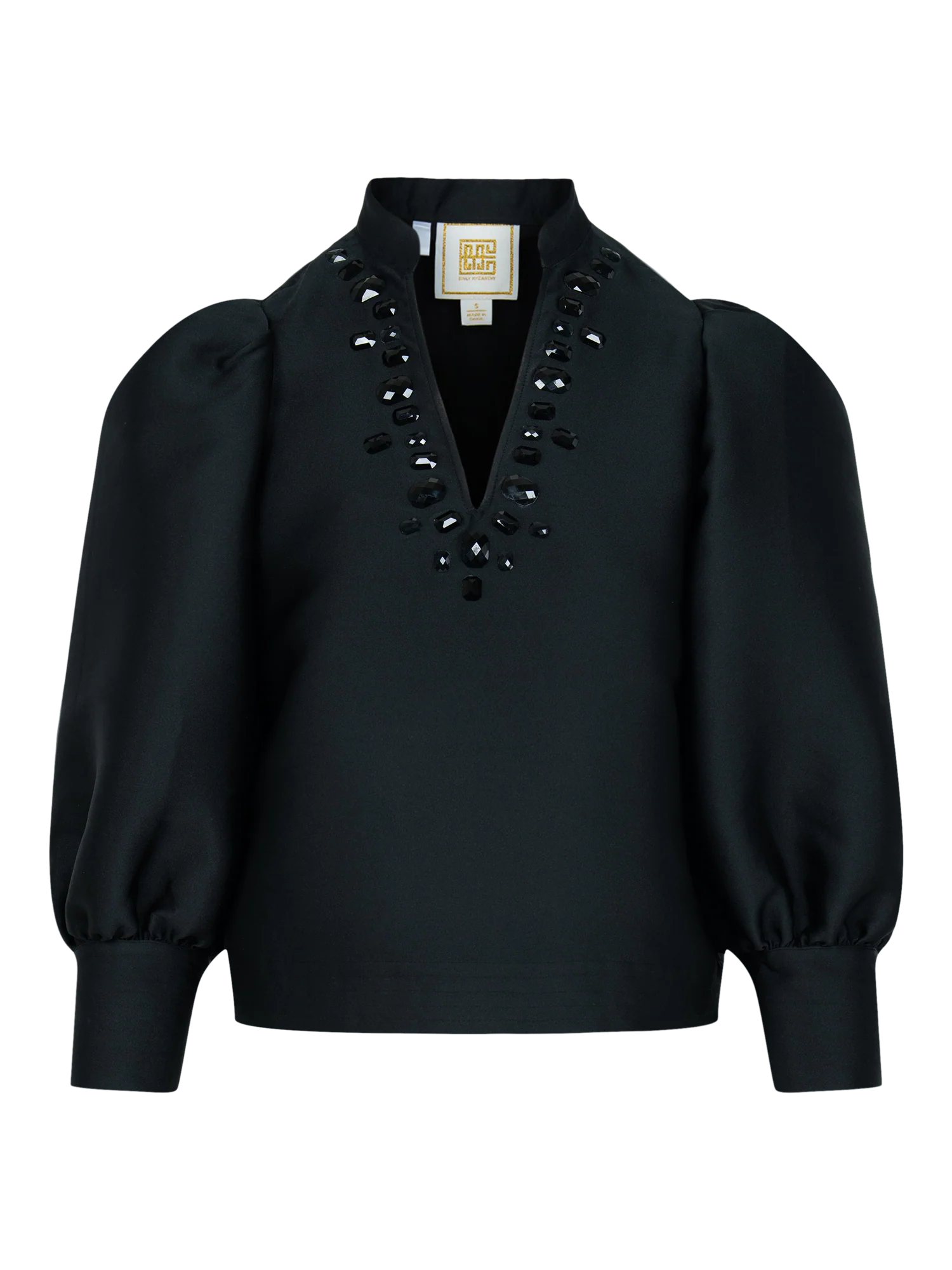 The Hampton Top in Midnight is structured perfection, designed with a lustrous finish and a hand-stoned neckline for an elevated touch. A mandarin-style collar frames the neckline, while puff sleeves with tapered cuffs add volume and balance. Its boxy yet tailored silhouette creates a refined shape that feels both modern and timeless.