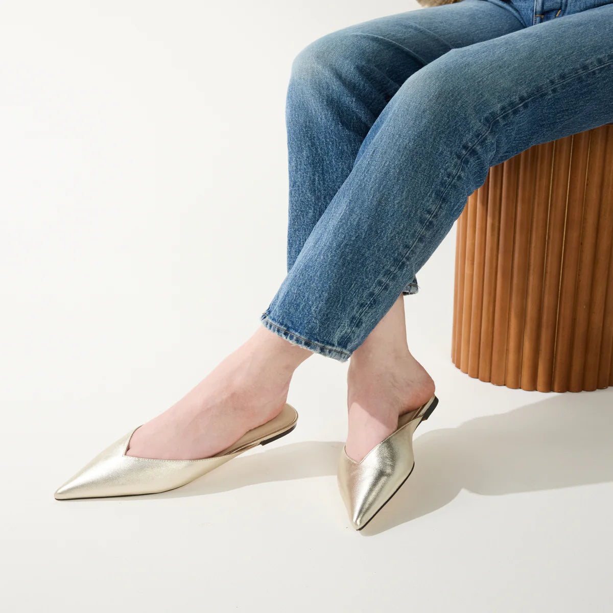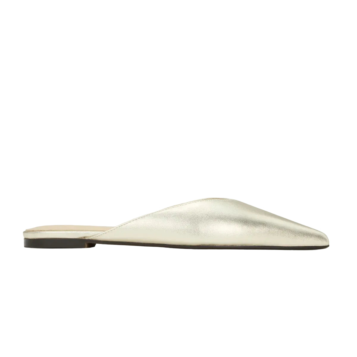Add a touch of effortless elegance to your wardrobe with this metallic leather pointed mule. Crafted from premium gold metallic leather, this sleek slip-on style features a refined pointed toe that elongates the silhouette. The softly cushioned footbed ensures lasting comfort, while the minimalist mule design makes it easy to wear from day to night. Polished yet versatile, this piece brings subtle shine to both casual and dressier looks.