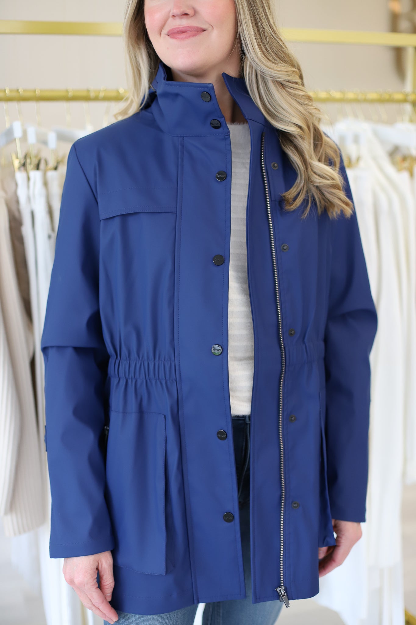 The chicest raincoat you ever did see! This waterproof jacket comes in the perfect shade of blue and is finished with luxe black hardware. A cinched waist creates a flattering silhouette, while button details add an elevated touch. Featuring a convenient tuck-away hood, it’s the perfect blend of fashion and function for any rainy day.