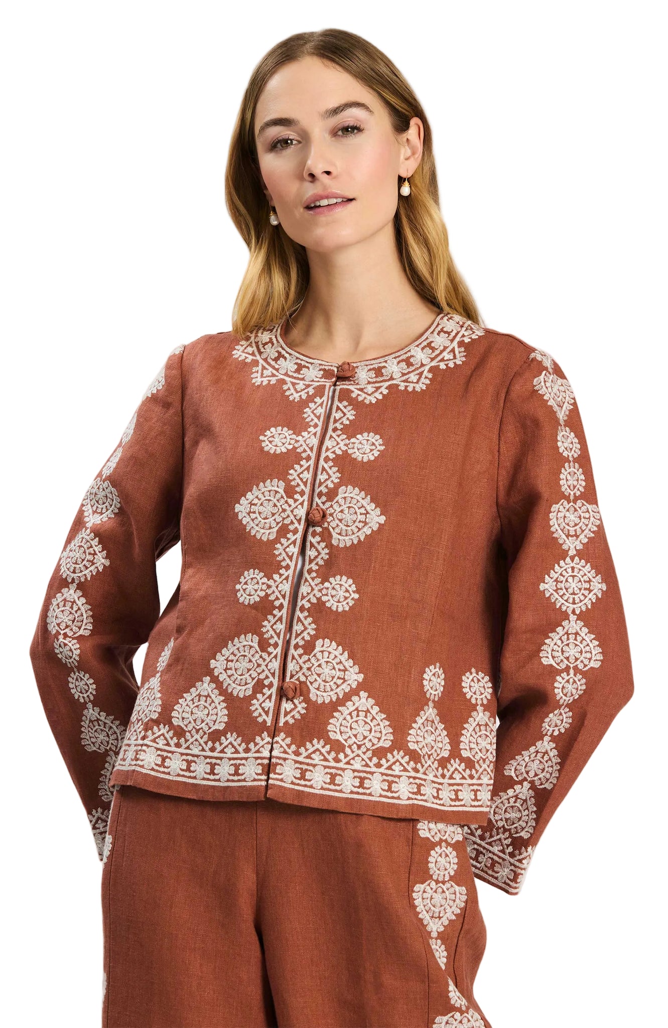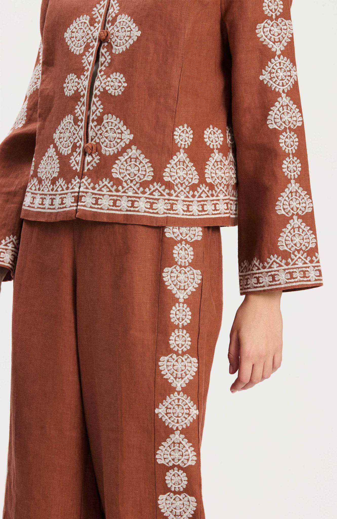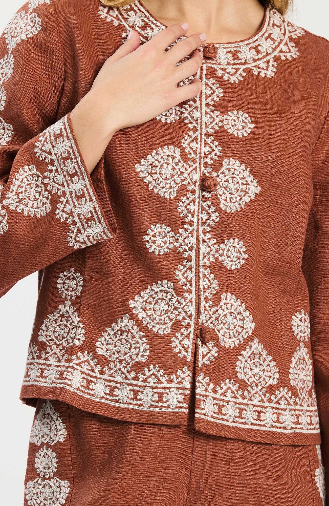 The Pia Linen Embroidered Jacket is a beautifully crafted statement layer designed to elevate even the simplest outfit. Made from breathable linen in a rich, warm hue, it features intricate embroidery throughout that adds texture, artistry, and a handcrafted feel. The clean, structured silhouette keeps the look polished, while the detailed trim and button-front closure make it feel special and timeless. Pair it with the matching Gianna Embroidered Linen Pant for an effortlessly chic, head-to-toe look that feels elevated yet easy—perfect for daytime gatherings or dressed-up evenings.
