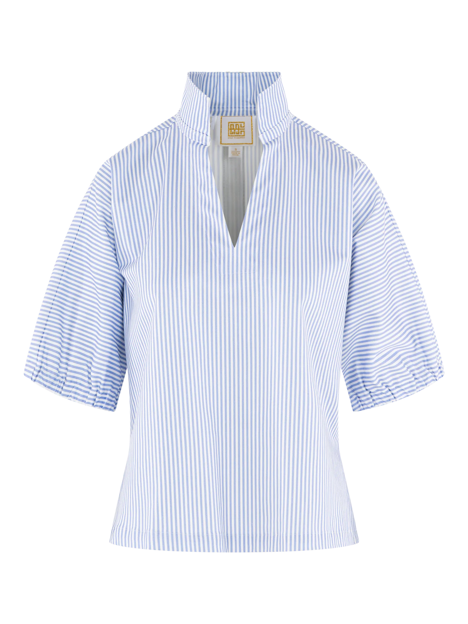 The Poppy Top in Grapemist Stripe is an effortless staple with a playful twist. Designed with a loose, easy silhouette, this style offers a relaxed feel while maintaining a polished look. Soft elastic dolman sleeves add gentle volume, balanced by a classic stand collar for a timeless finish. This top brings a fresh, spring-ready appeal, elevated by an unexpected pop of color along the back with green and blue trim. Thoughtfully detailed and endlessly wearable, this top delivers everyday ease with a touch of joyful distinction.