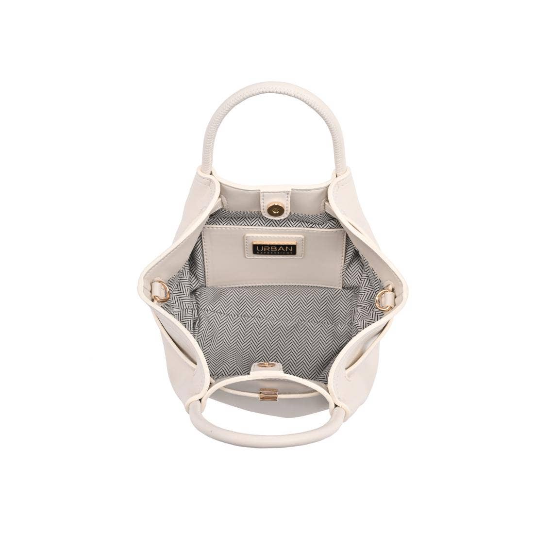 - Closure: gold-tone snap at the top center secures the main opening for quick one-handed access while keeping contents contained and easy to reach.