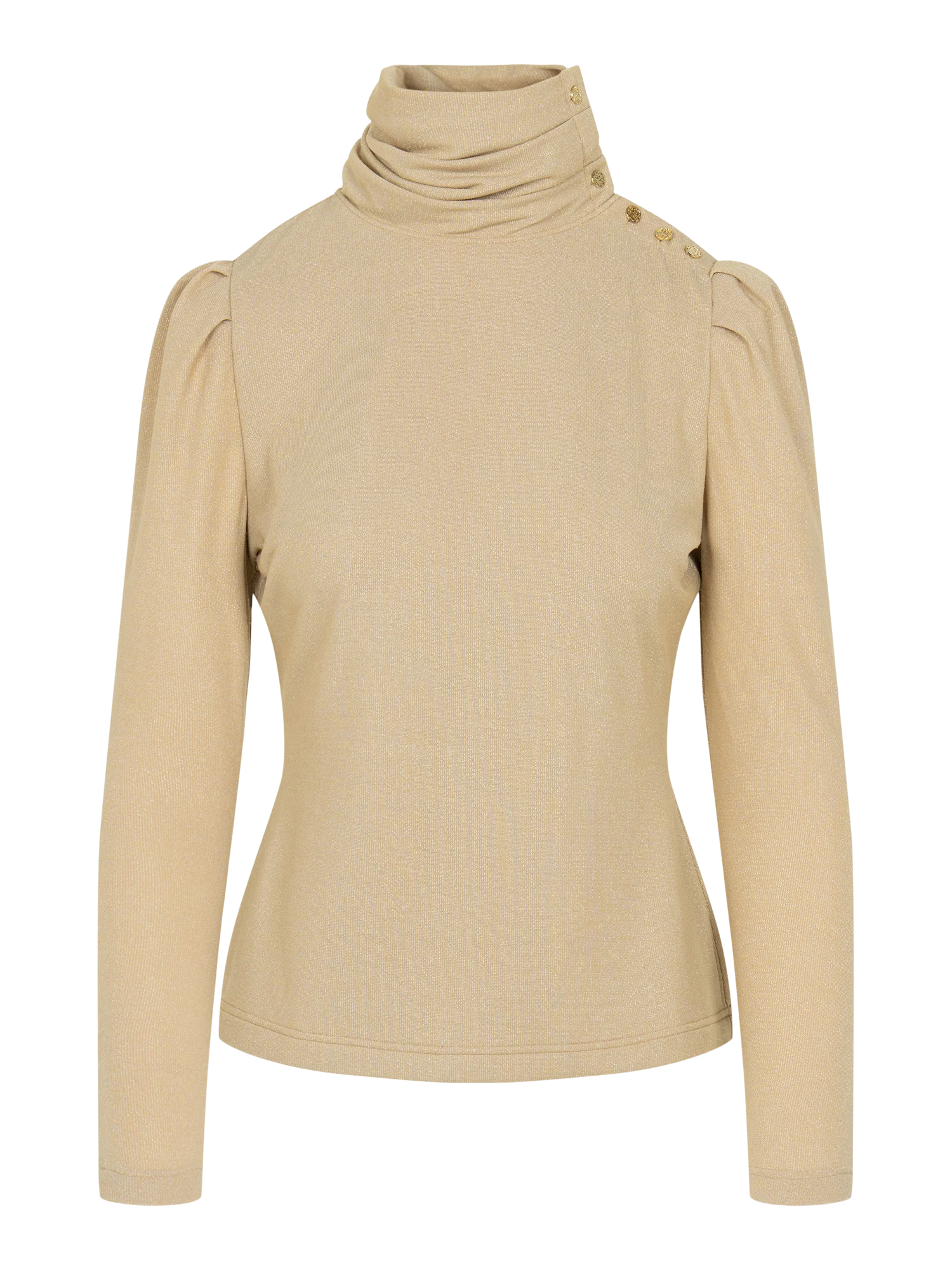 - Gathered mock neck w/ gold button opening