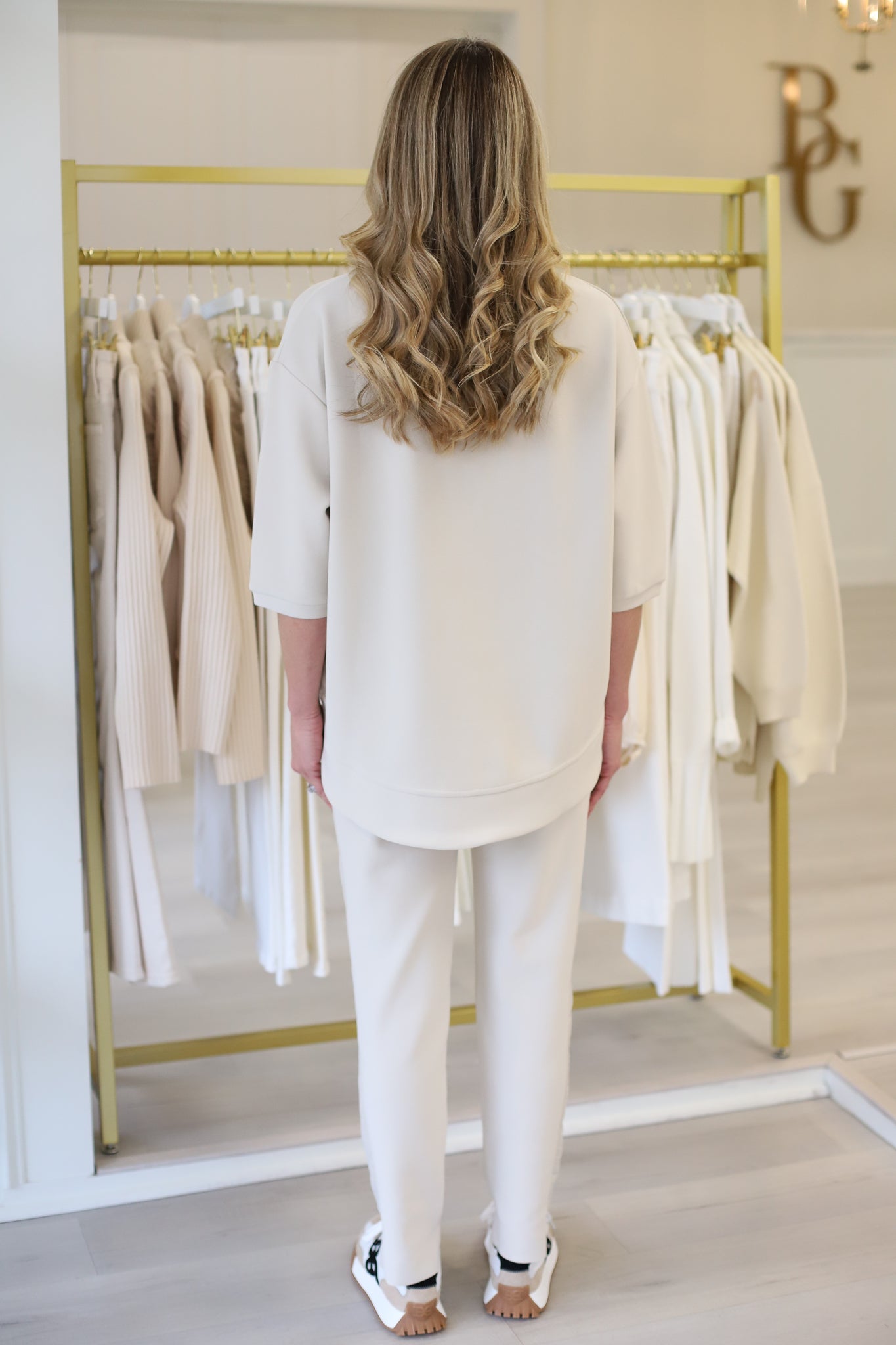 • Pant: Elastic waist for the perfect fit. Side pockets and side contrasts. Bottom high-low with details