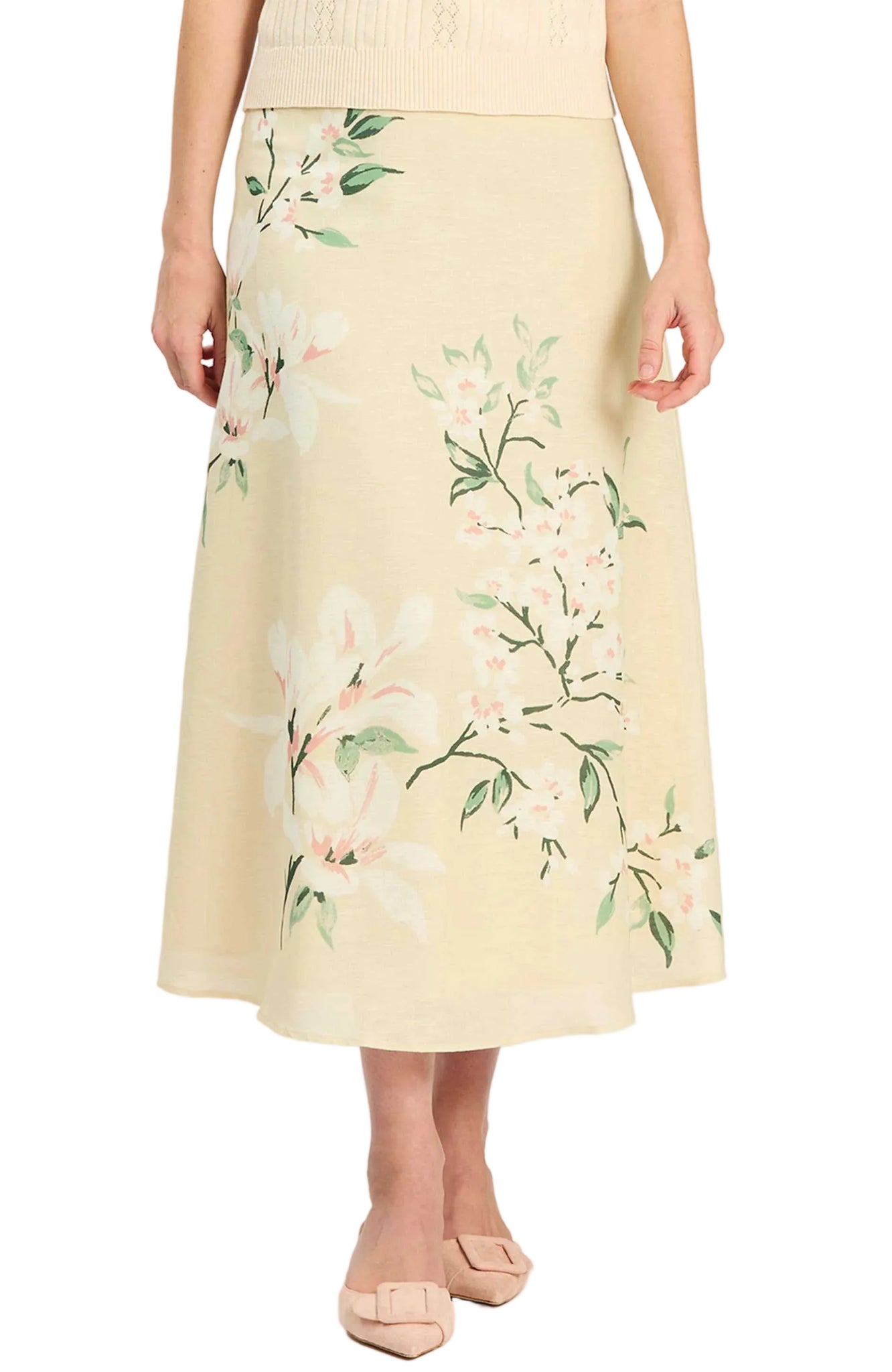 This linen skirt is an effortless warm-weather staple with a feminine, polished feel. Designed in a soft floral print, it features a clean, streamlined silhouette that falls beautifully and moves with ease. The lightweight linen fabrication keeps it breathable and comfortable, making it perfect for all-day wear. Pair it with the Reid Vest for a tailored, coordinated look, or layer on the Cindy Cardigan for an easy, pulled-together outfit that transitions seamlessly from day to night.