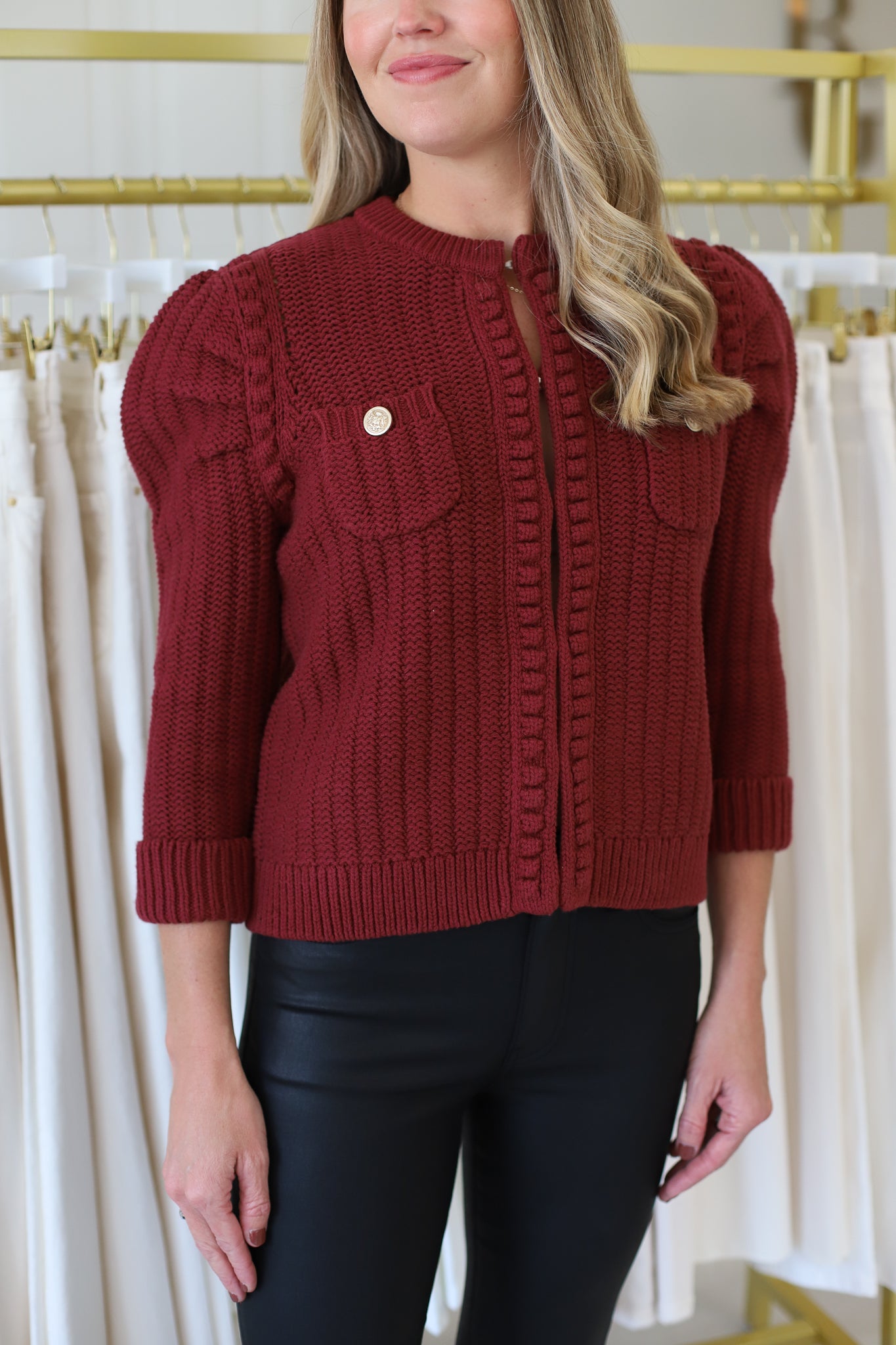 This cardigan can be worn like a little couture jacket that's revisited in knit. The cardigan has a slightly cropped shape, a round neckline and statement puffed shoulders. Elevated with gold buttons, this piece is easy to wear mid-season and layered as the weather gets colder.