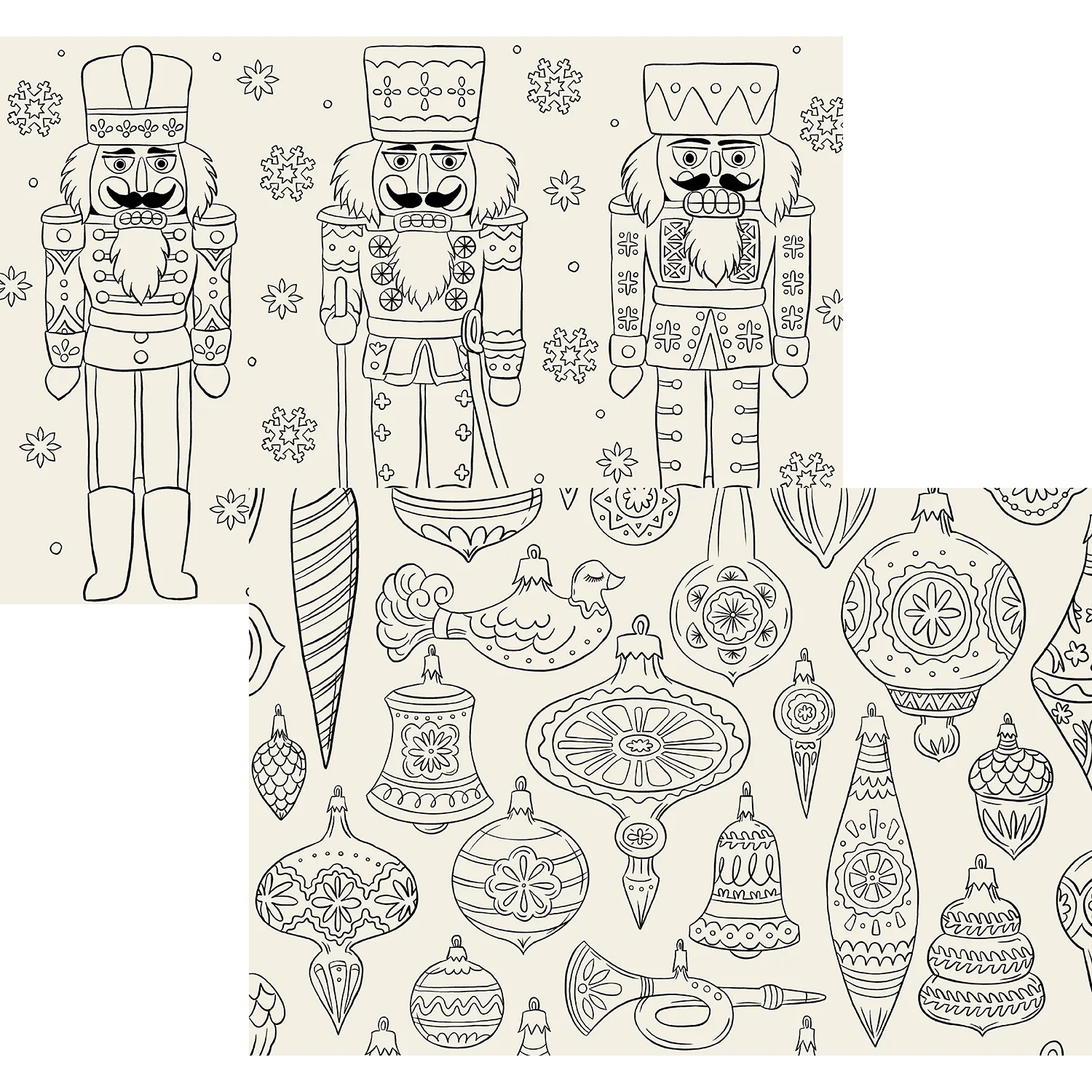 Everyone will want a seat at the kids’ table with this fun and versatile Christmas Coloring Placemat! This classic pad boasts two designs for even more creativity opportunity, with one side featuring a collection of ornate ornaments, while the other shows playful nutcrackers. Take your pick and let the fun begin!
