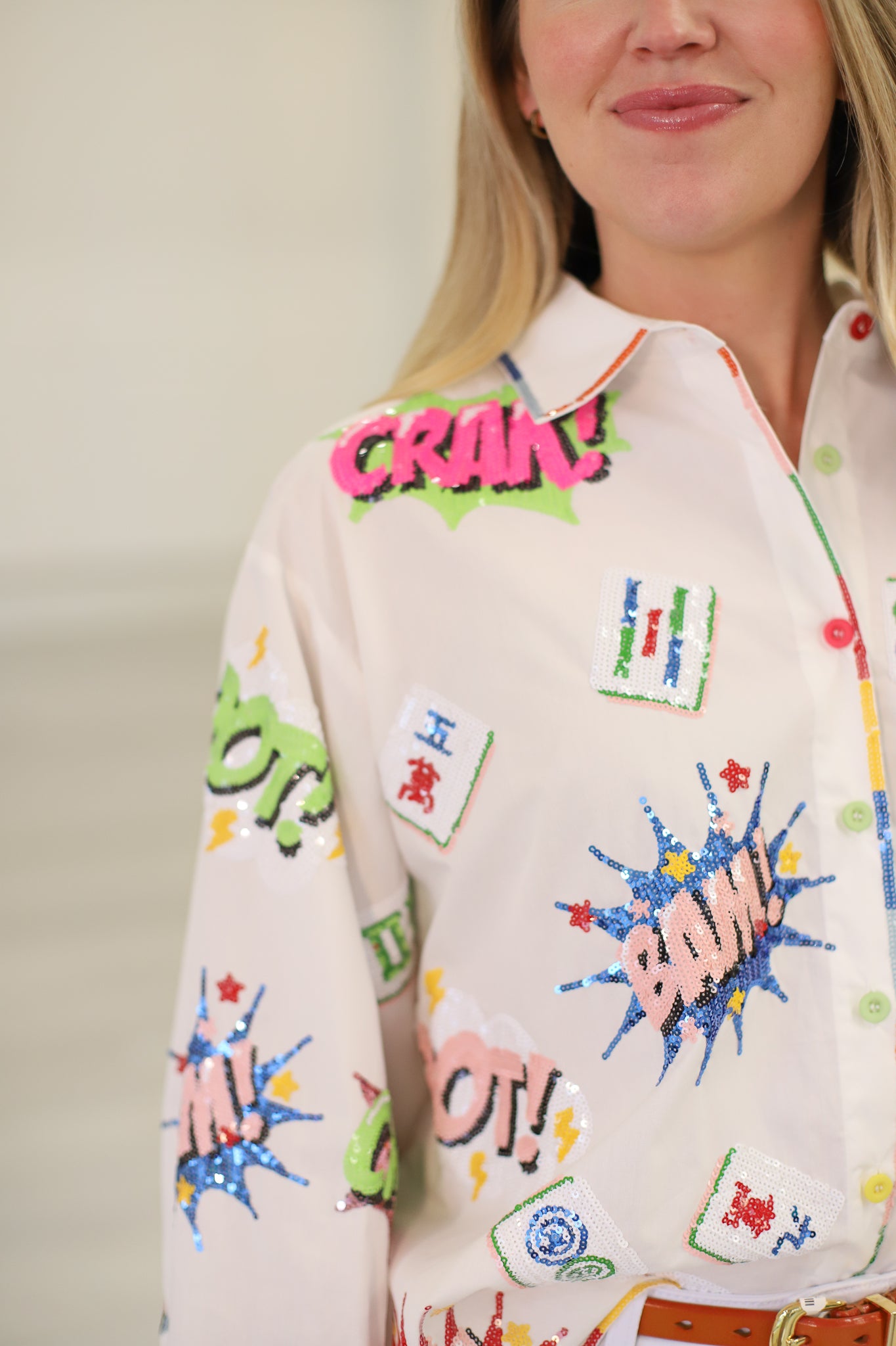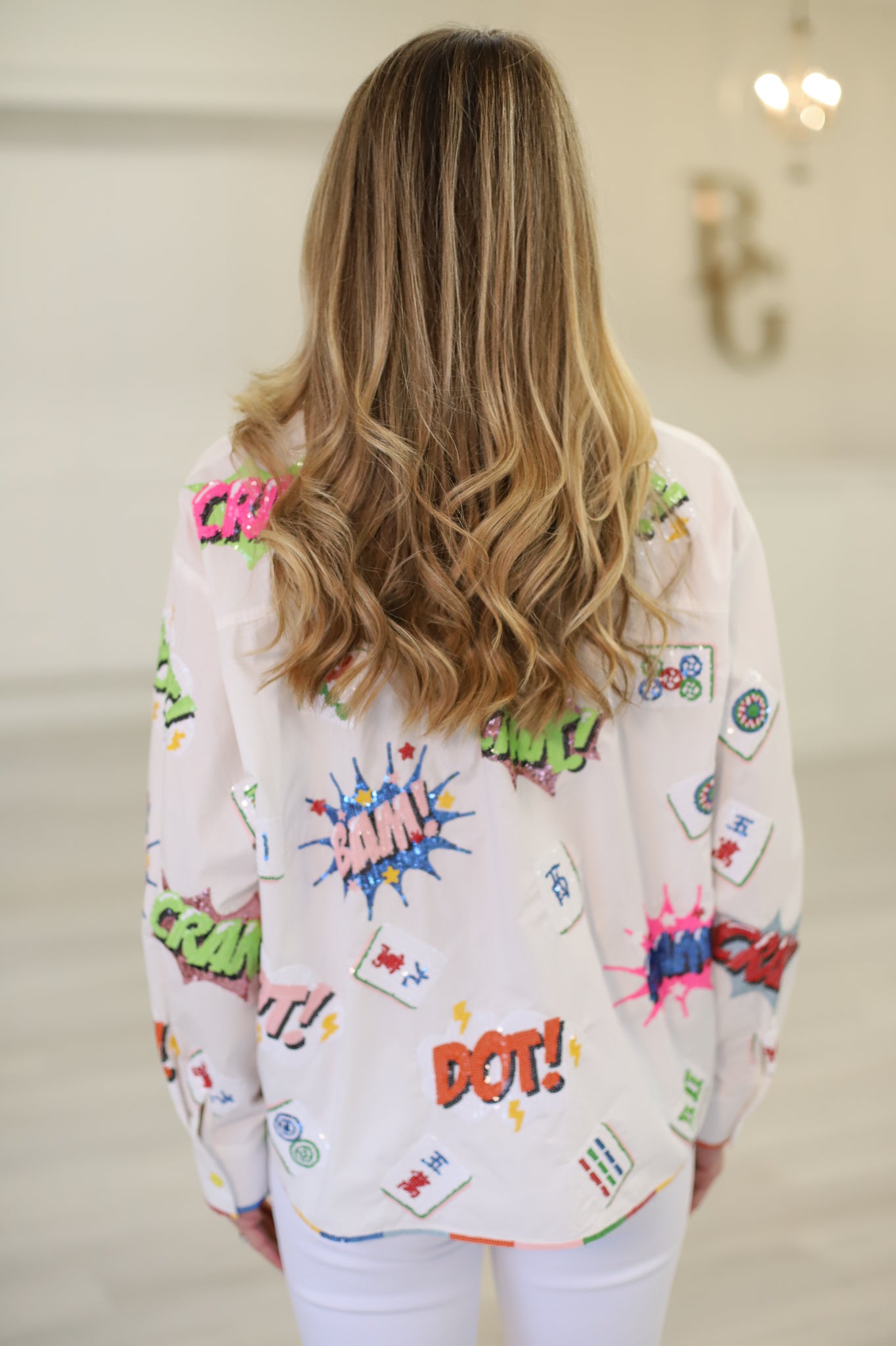 Bring the glam and the games with this show-stopping collared top from Queen of Sparkles. Featuring a bold mahjong icon design on crisp white fabric, it's finished with a vibrant rainbow trim that adds instant personality to your wardrobe. Perfect for anyone who loves mixing retro gaming vibes with modern sparkle, this piece is a conversation starter that celebrates bold style and playful confidence. Dress it up or down—either way, you're winning.