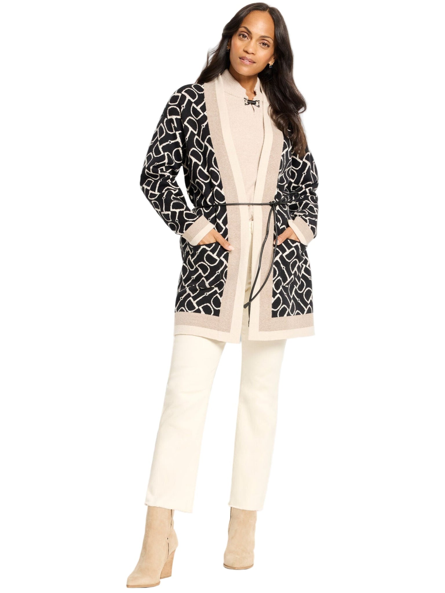 Based on vintage equestrian jackets, this unique piece blends heritage inspiration, trending equestrian styles, and modern ease. The body's motif nods to the monogram trend. (Look closely and you'll notice that the design is actually a horse bit shape.) Framed with contrast color trim for a polished finish, it features a soft shawl collar, roomy patch pockets, and a touch of extra length for elegant coverage. Cinch the look with the faux leather belt for flattering definition.