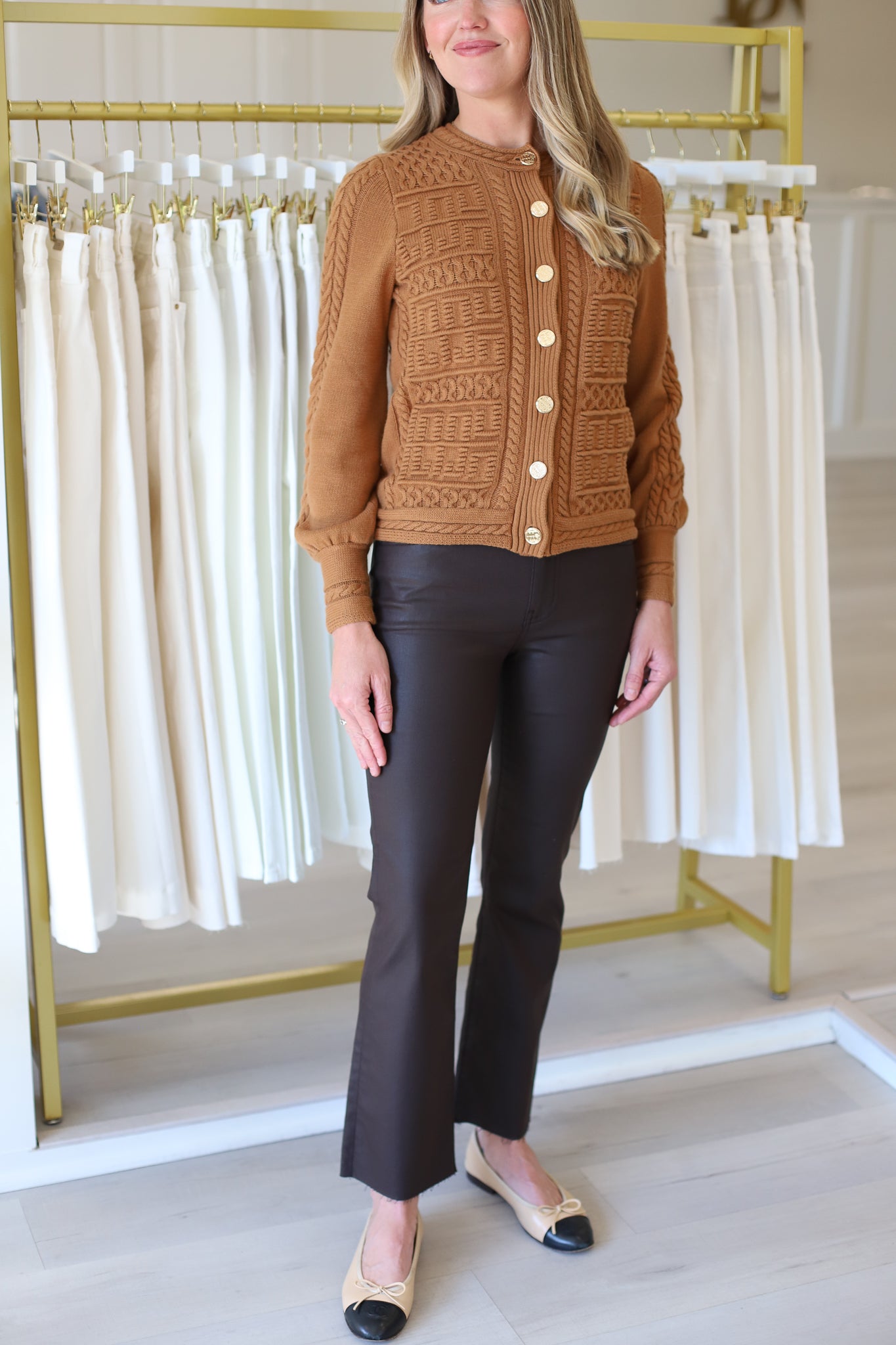 The Chloe Cardigan in Brown Sugar is a timeless knit reimagined with signature details. Designed with a crew neckline and a gold logo button front, this piece highlights intricate cable knitting interwoven with our signature logo motif across the body and sleeves. Braided trim accents the cuffs and hem, adding depth to the texture. Subtle volume at the sleeves provides a modern touch, while the tailored length makes it versatile for layering. A rich, warm tone completes this cardigan, making it an instant wardrobe staple.