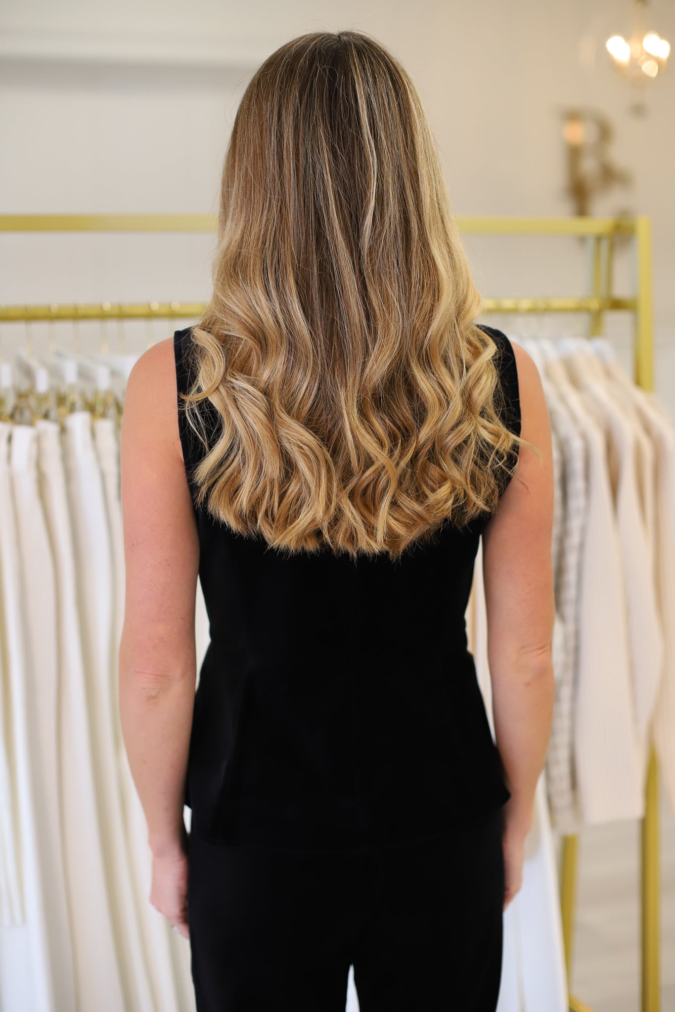 We turned our Claire Dress into a peplum style top, featuring a jewel neckline, fitted bodice, and flared hem. This timeless silhouette is perfect for everything from a day in the office to a Holiday ensemble.