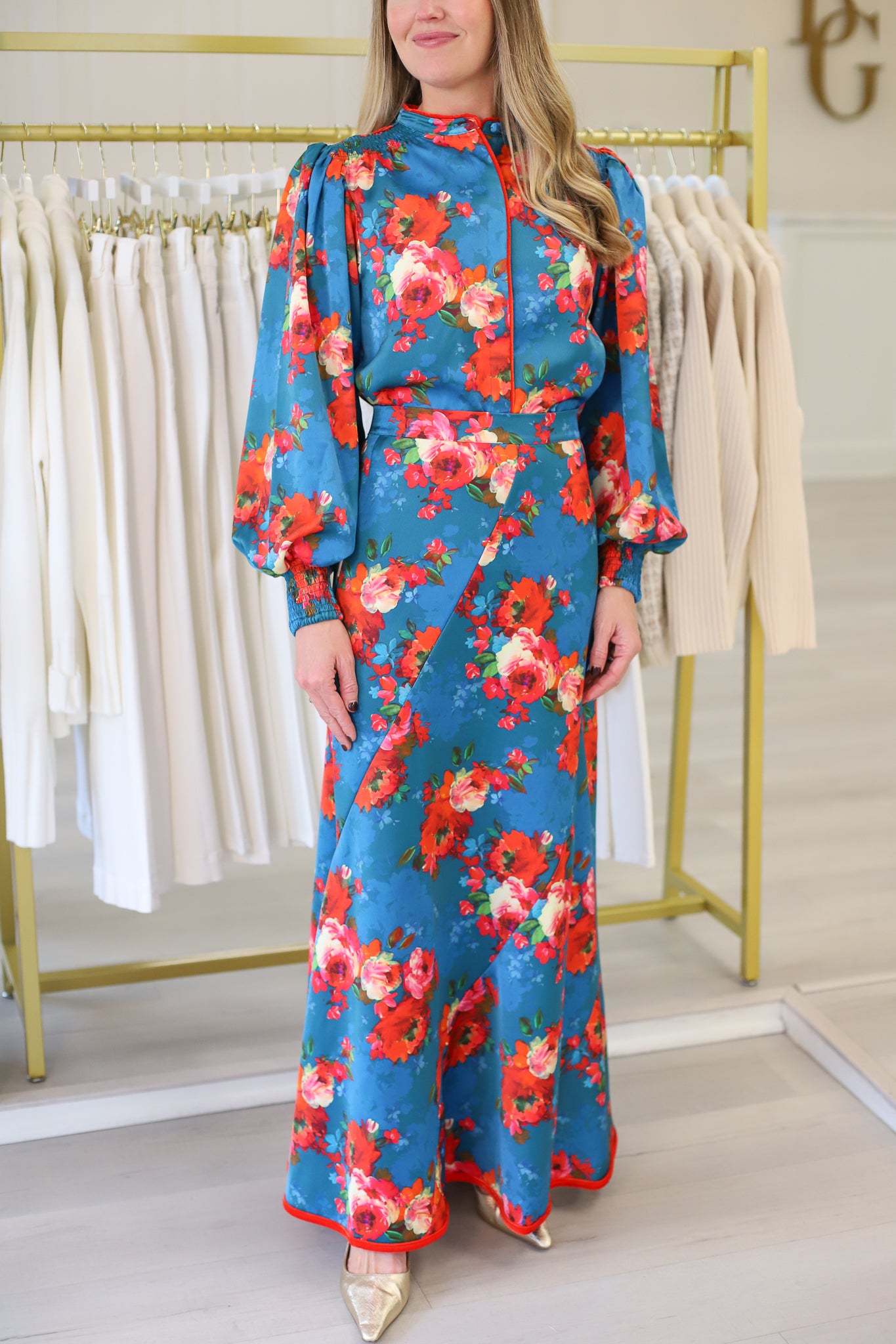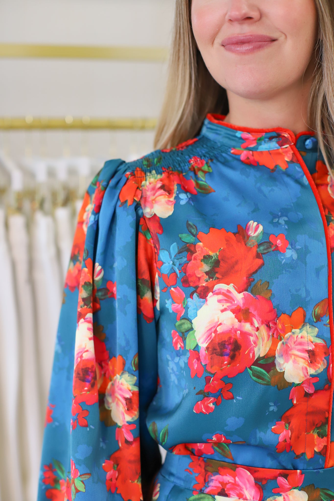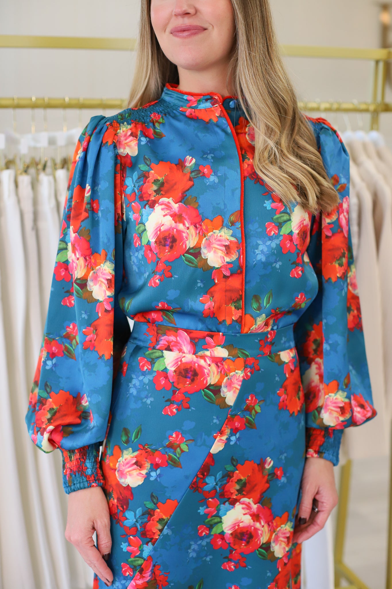The Emily Top is the perfect button front blouse, featuring a mandarin collar, covered placket, and balloon sleeves. This season, she is cut from a light satin fabric in our Holiday Chintz Teal print, great for dressing up or down this season.