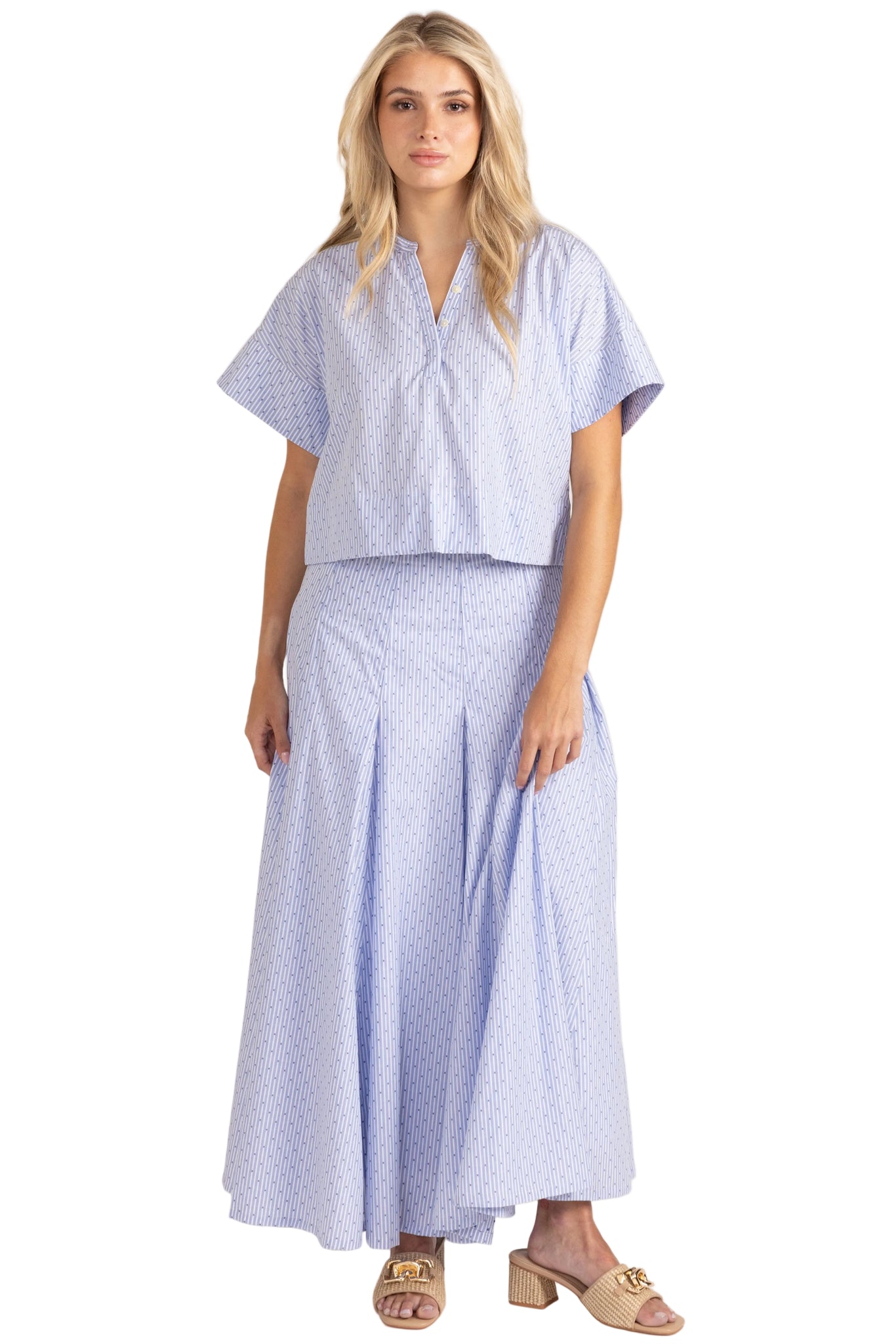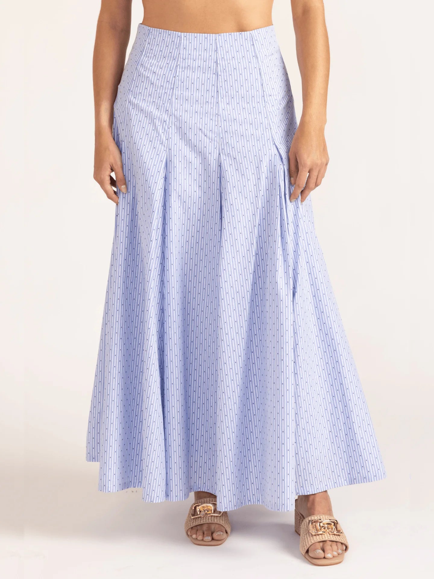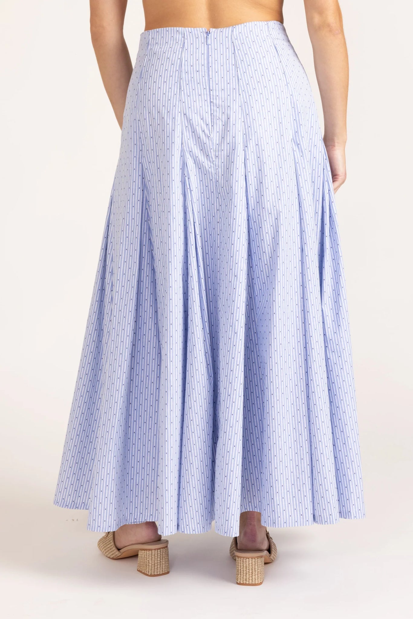 A refined skirt balancing structure and fluidity. Fitted waist with pleats flows into an airy silhouette in soft blue diamond stripe. Back zipper closure. Effortless elegance for any occasion.