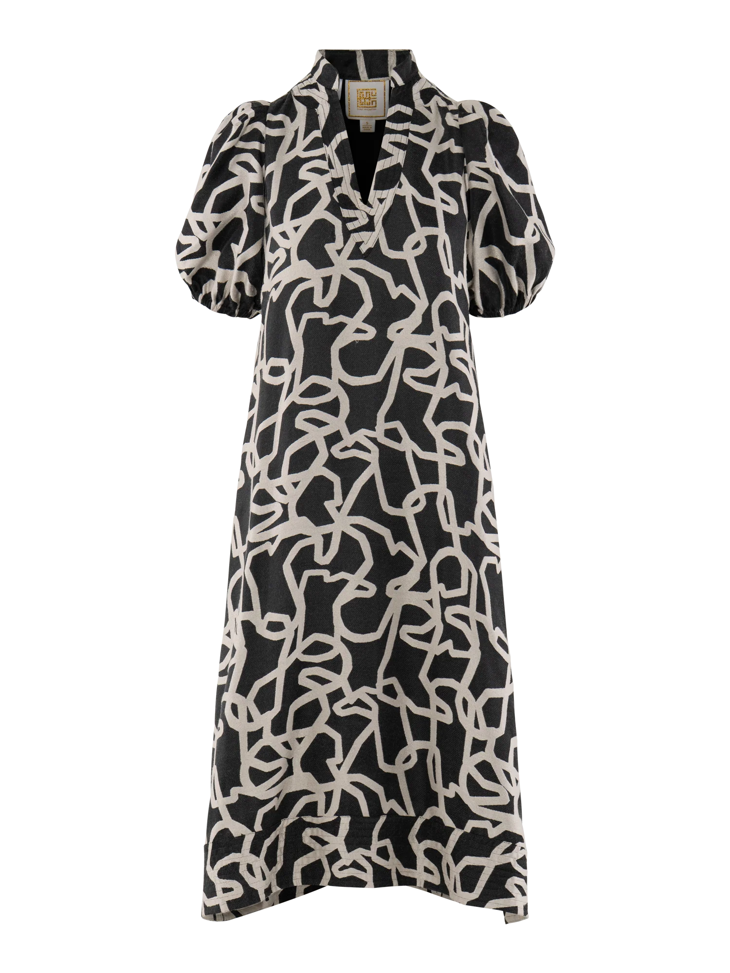 The Hampton Dress in Boot Print showcases an abstract pattern created from interlocking boot outlines, a nod to western heritage reimagined with modern flair. The black and ivory woven fabric adds soft texture and visual dimension, giving the design depth and character. This midi-length silhouette features a mandarin collar, V-neckline, puff sleeves, and a trapunto-stitched hem, finished with functional side seam pockets for effortless wear.