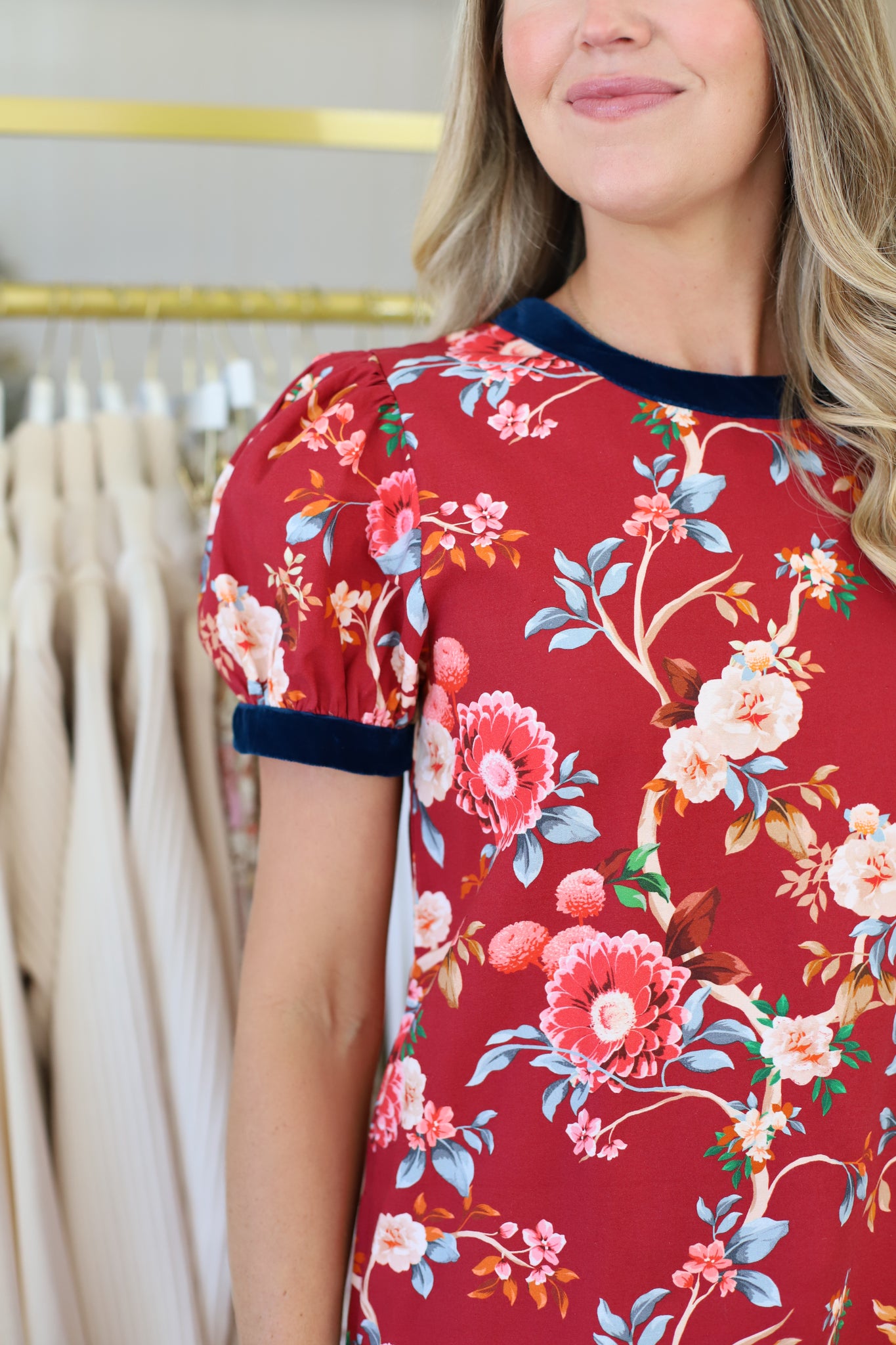 Louisa is a consistent fan favorite, and this season's version is no exception. She boasts the same round neckline, shift silhouette, and puff sleeves that you know and love. This season, Louisa is back in our Chinoiserie Scarlett print with velvet trim.