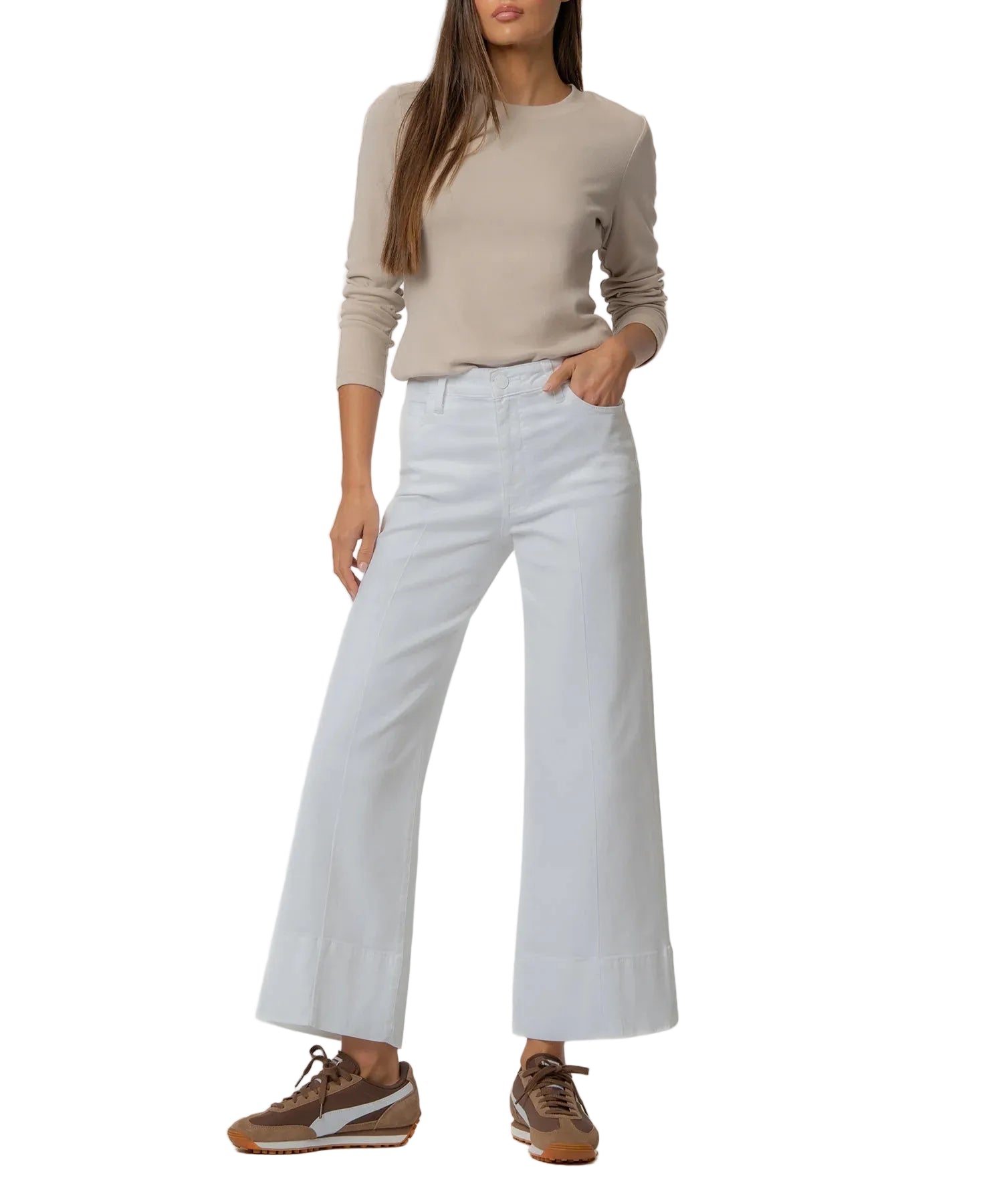 Elevate your look with our high-rise wide leg pants in sleek optic white. Designed with a refined wide hem and stylish front pin tuck, they offer a clean, modern silhouette. Made from a stretchy material for all-day comfort, these pants deliver the perfect blend of structure and ease. Ideal for effortless everyday style.