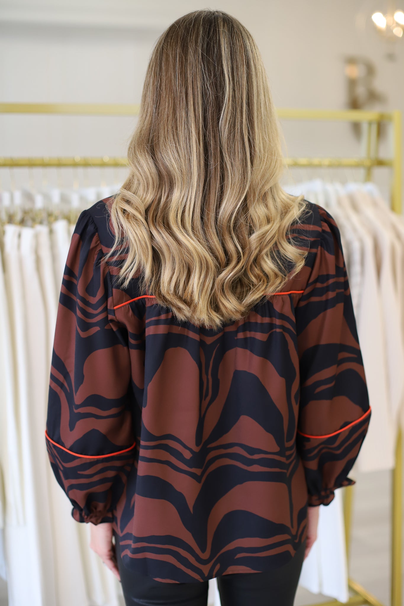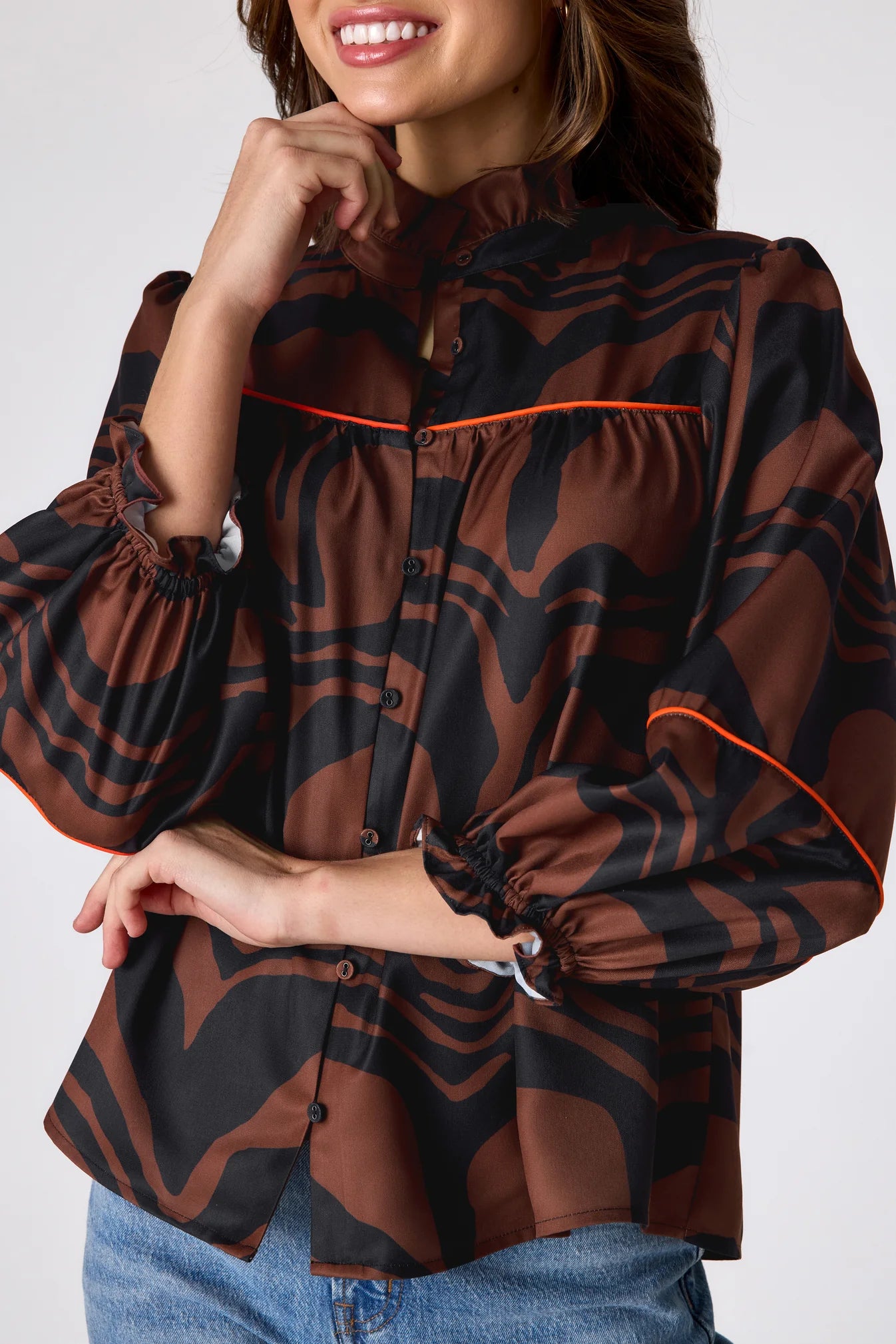 Our most-loved Worth Blouse returns! Effortlessly feminine with a flowy fit, ruffled neckline, ¾-length puff sleeves, and eye-catching contrast piping, it’s a must-have you’ll reach for again and again.