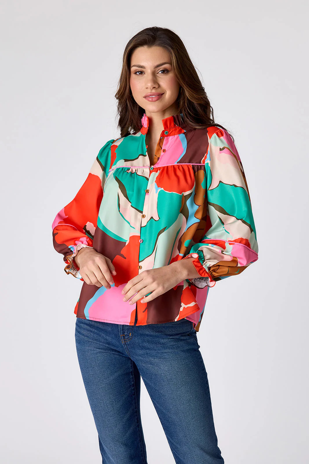 Our most-loved Worth Blouse returns! Effortlessly feminine with a flowy fit, ruffled neckline, ¾-length puff sleeves, and eye-catching contrast piping, it’s a must-have you’ll reach for again and again.